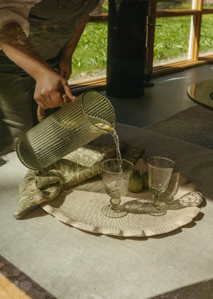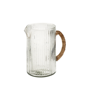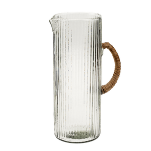 The Montauk Pitcher was inspired by clear ocean waters and features an organic, hand blown form with woven cane handle. The vertical ribbed pattern, adds an elegant texture that beautifully catches the light and ripples of the water. Beachy in feel, this pitcher adds a laid back and tranquil feeling to any table setting.