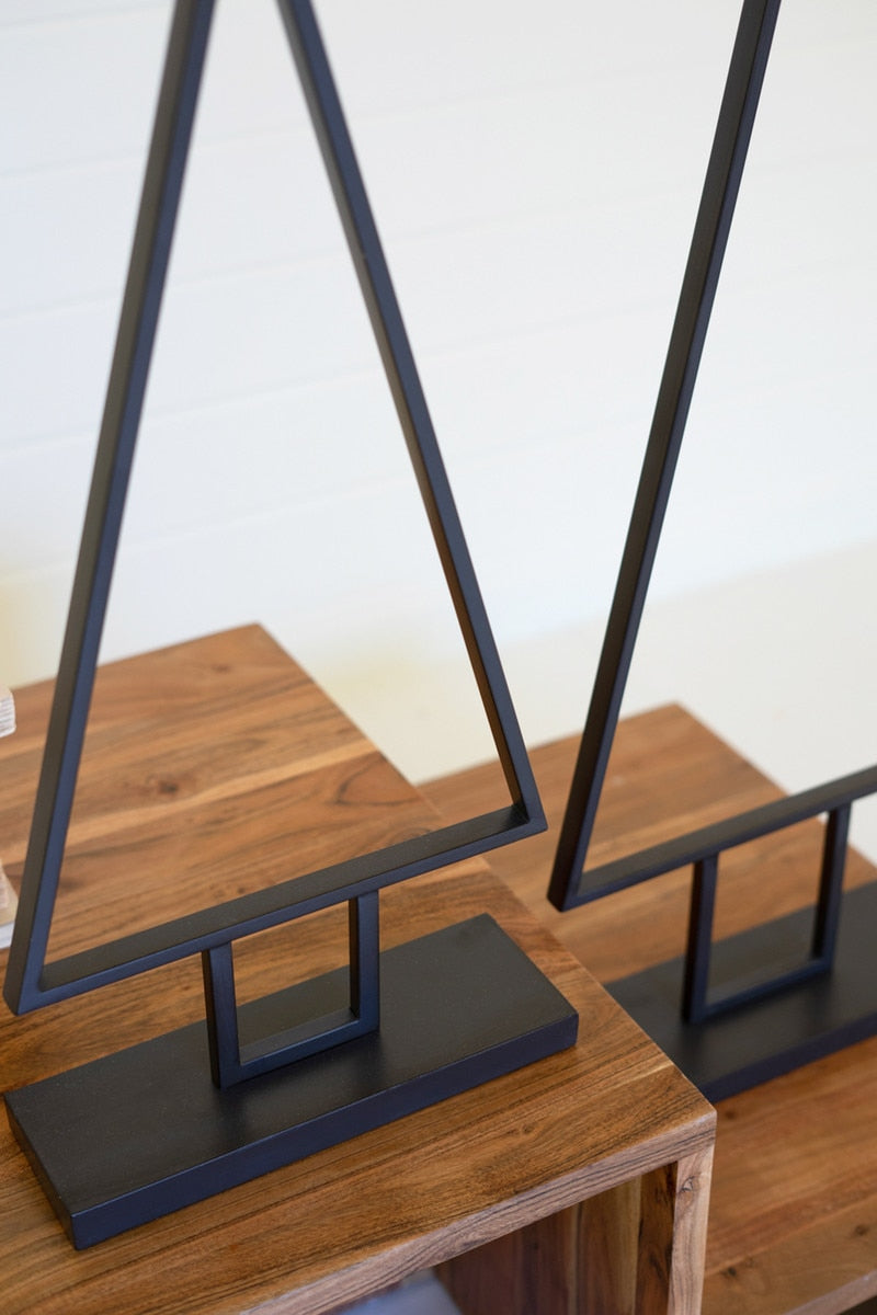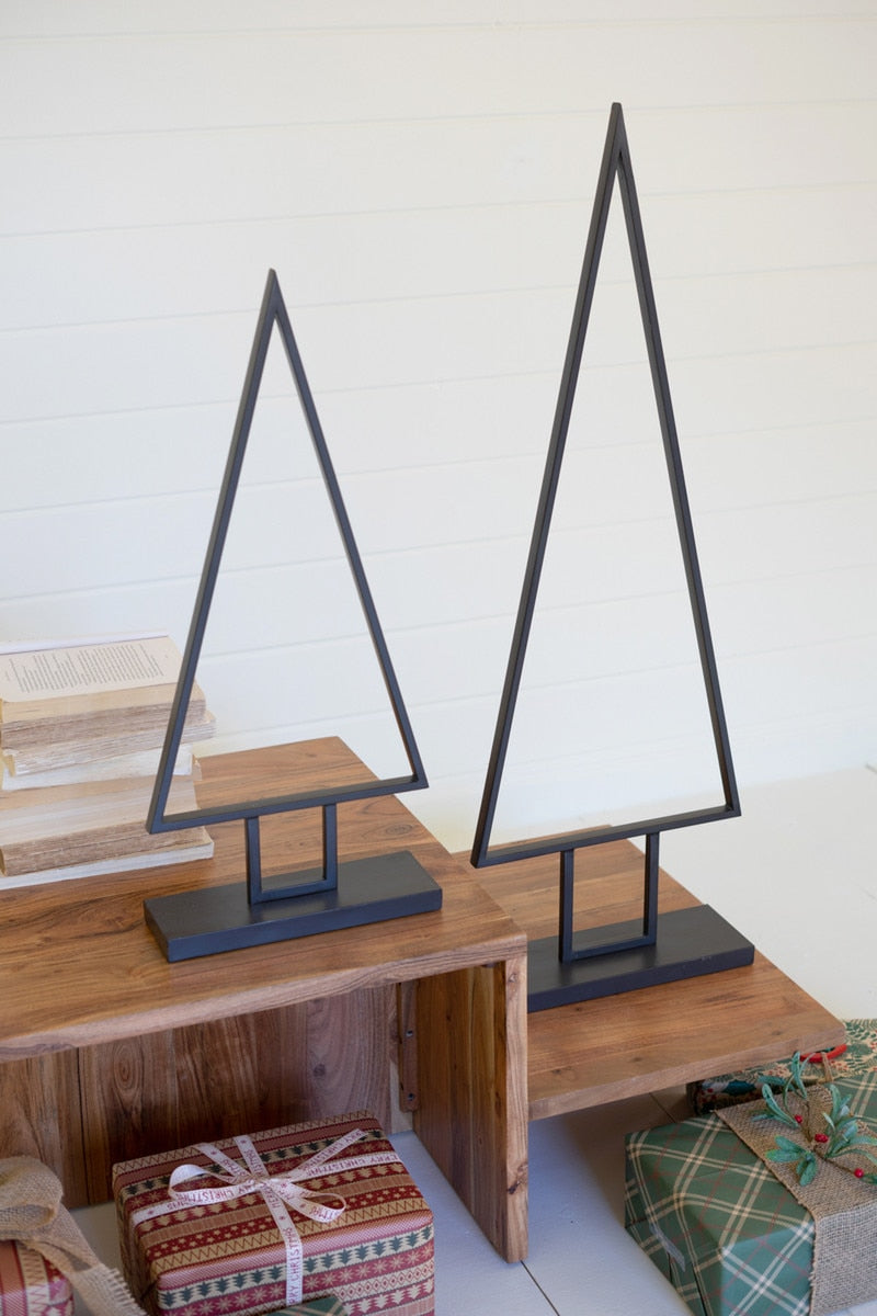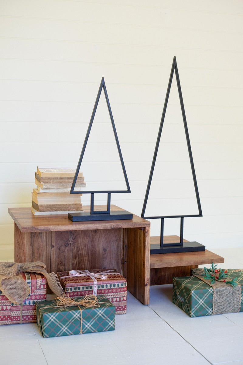 Try these triangular tree topiaries this holiday season. They stand alone as Christmas decor, or you can deck the halls by wrapping them with garland or ribbon. They make a great gift for minimalist or creative decor. Large: 13.5" x 4.5" x 40"t Small: 12" x 4" x 27"t