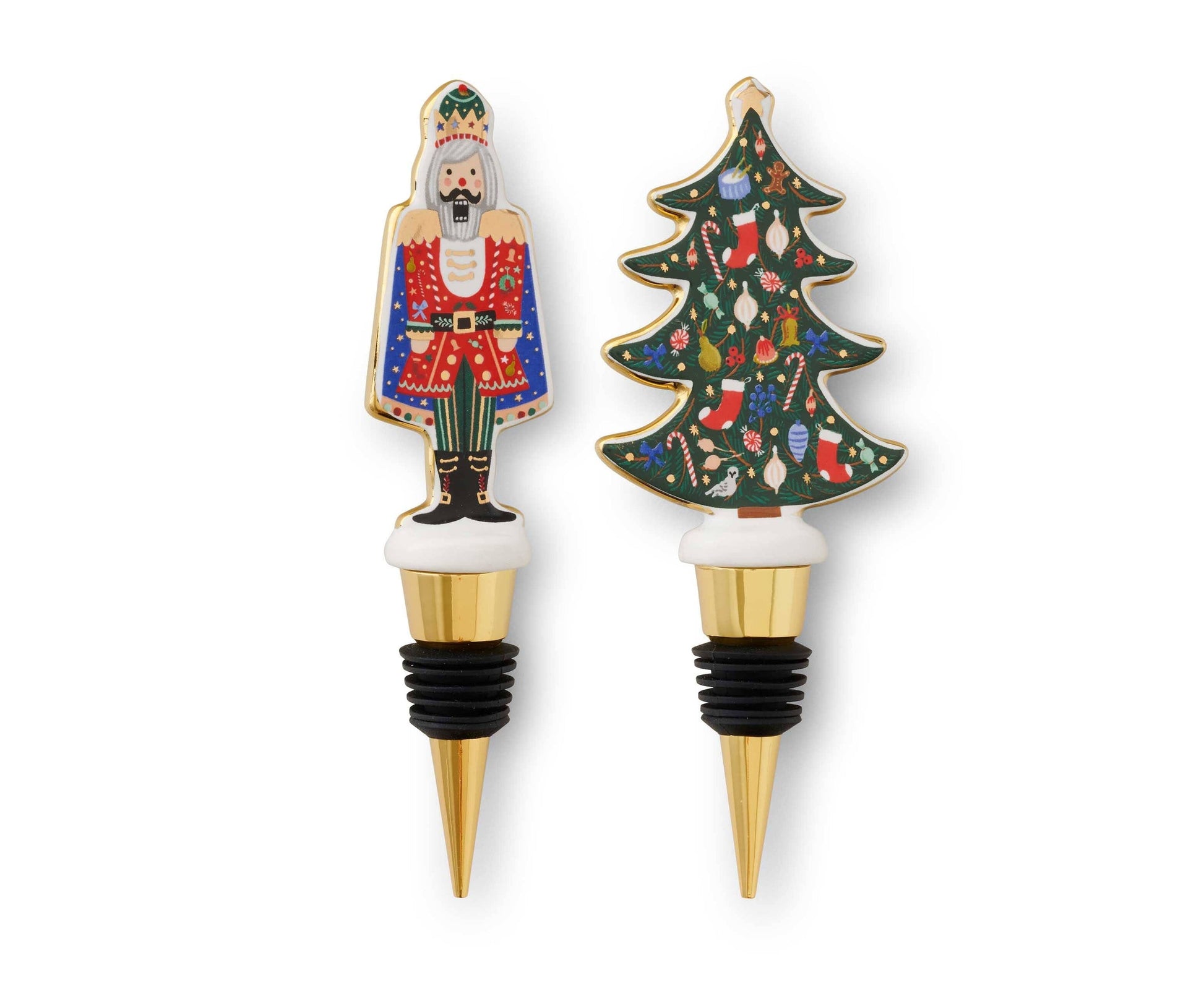 Add festive charm to your wine collection with this Nutcracker Porcelain Wine Stopper Set. Featuring a nutcracker and a Christmas tree, each stopper is beautifully decorated with Rifle Paper Co’s signature illustrations and elegant gold foil accents. These stoppers not only preserve your wine’s freshness but also bring a joyful holiday spirit to your gatherings. Perfect for gifting or adding a touch of seasonal cheer to your home.