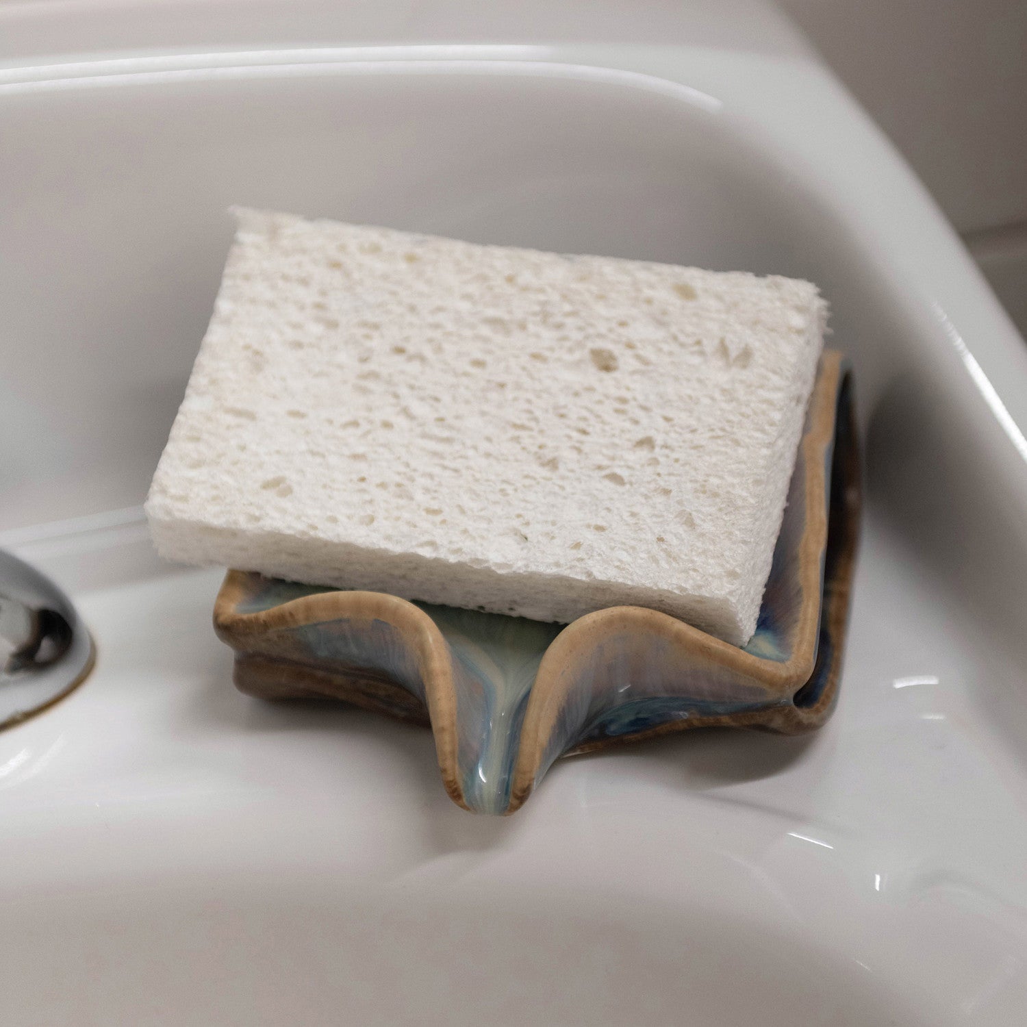 Elevate your kitchen or bathroom with this refined stoneware sponge holder and soap dish. Measuring ½" square by 1¾" high, it features a practical drip spout to keep surfaces dry and clean. Each piece is finished with a unique reactive glaze, offering subtle variations in two elegant color options. This functional accessory combines durability with understated style, making it a sophisticated addition to your daily routine.